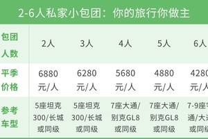 若您的假期和以上排期不一致我们提供私家定制团可以随时出发,国庆黄金周除外。私家小团都是司机兼职领队,如需要安排领队(平时领队+500元/天+领队食宿补助200元/天)