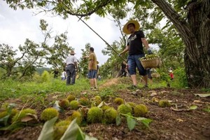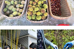 "板栗好吃果难摘",板栗裹着带刺的壳就像一个个小刺猬一样,要用长长的杆子将板栗从树上打下来,穿上长袖长裤带上帽子,千万要小心不要被掉落的板栗壳扎到!