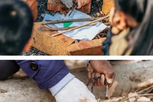 将叫花鸡的表面包裹上锡箔纸后,再在上面涂上泥桨,将其厚实地包裹住。泥土是最质朴,最天然的材料,制作叫花鸡,获得关于泥土的直接经验