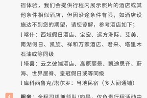 3、沿途系维吾尔族地区,请游客尊重当地宗教信仰、民俗民风,遵守景区规定。行程若存在景点需骑马,为您的安全着想,骑马必须由马夫牵缰方能骑行,请勿独自骑马或骑马奔跑,险路及下坡路必须下马步行,否则造成的损伤,概由游客自行承担。