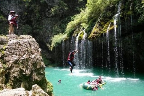 10:00领队分发门票领取人体漂流装备(安全帽、救生衣,溯溪鞋),由景区安全员带入景区、亲身体验激情无险的人体漂流、体验一米/二米/四米/八米得跳潭乐趣。