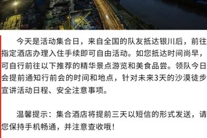 今日沿途可俯瞰月亮湖(不进入湖内),碧绿湖水、漫漫黄沙、蔚蓝天空在这里交织成一个美妙的画卷,继续行走10公里到达终点! 领队在终点为大家颁发奖牌,集沙瓶,合影留念;午餐过后,大家一起返回银川解散。